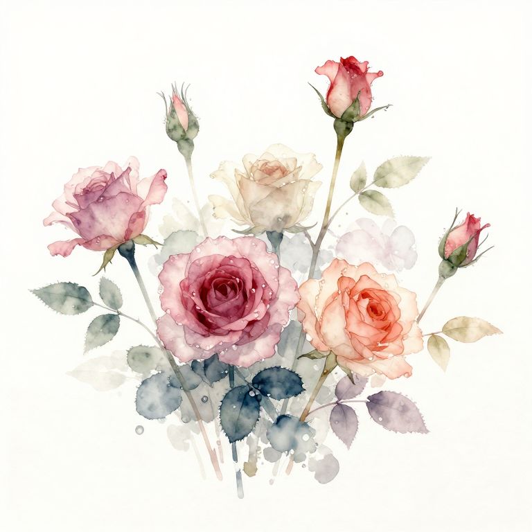 Run Cycle many colorful organza roses with buds and leaves , low angle view , wet washed watercolor and alcohol ink with white background , soft muted colors , very light pale tones,