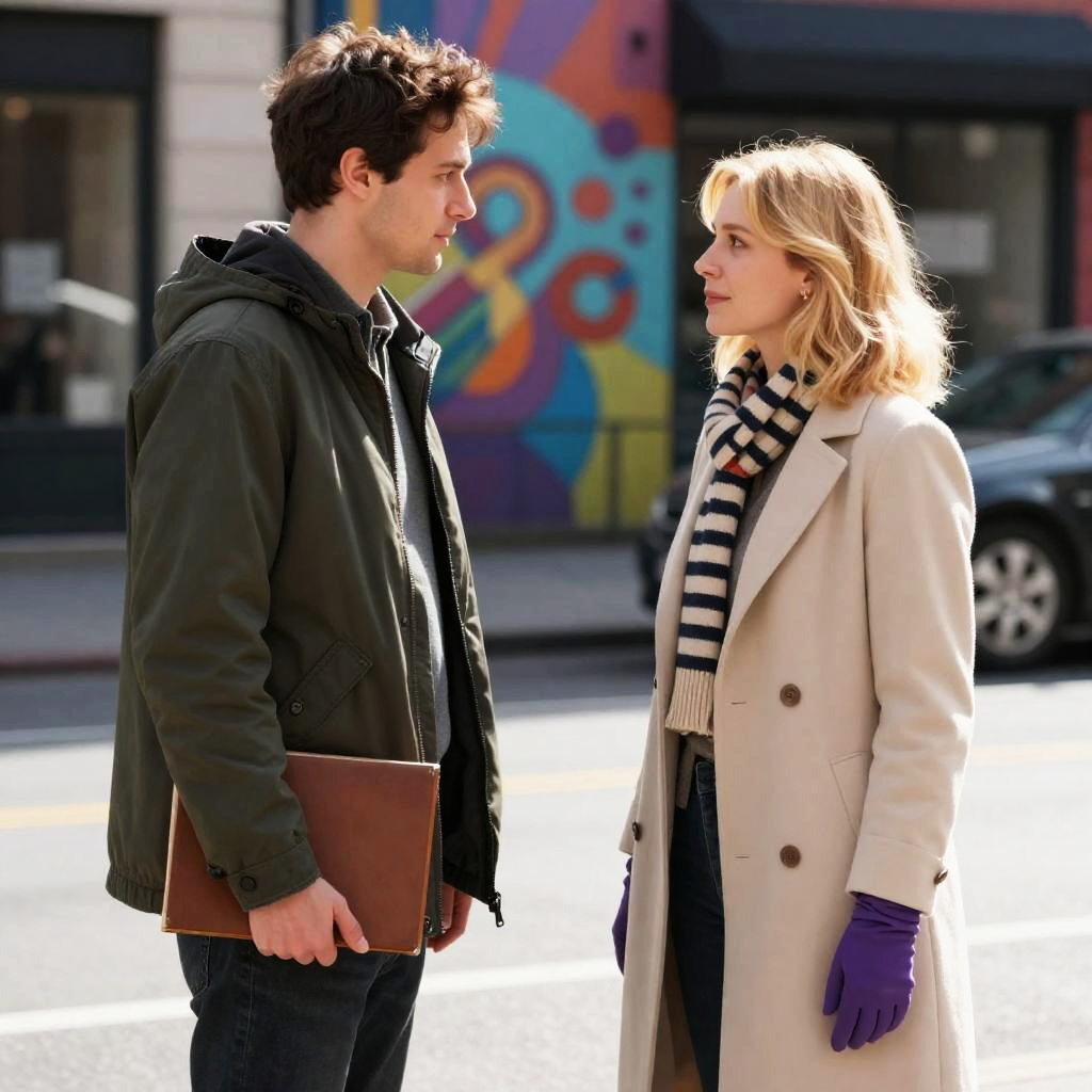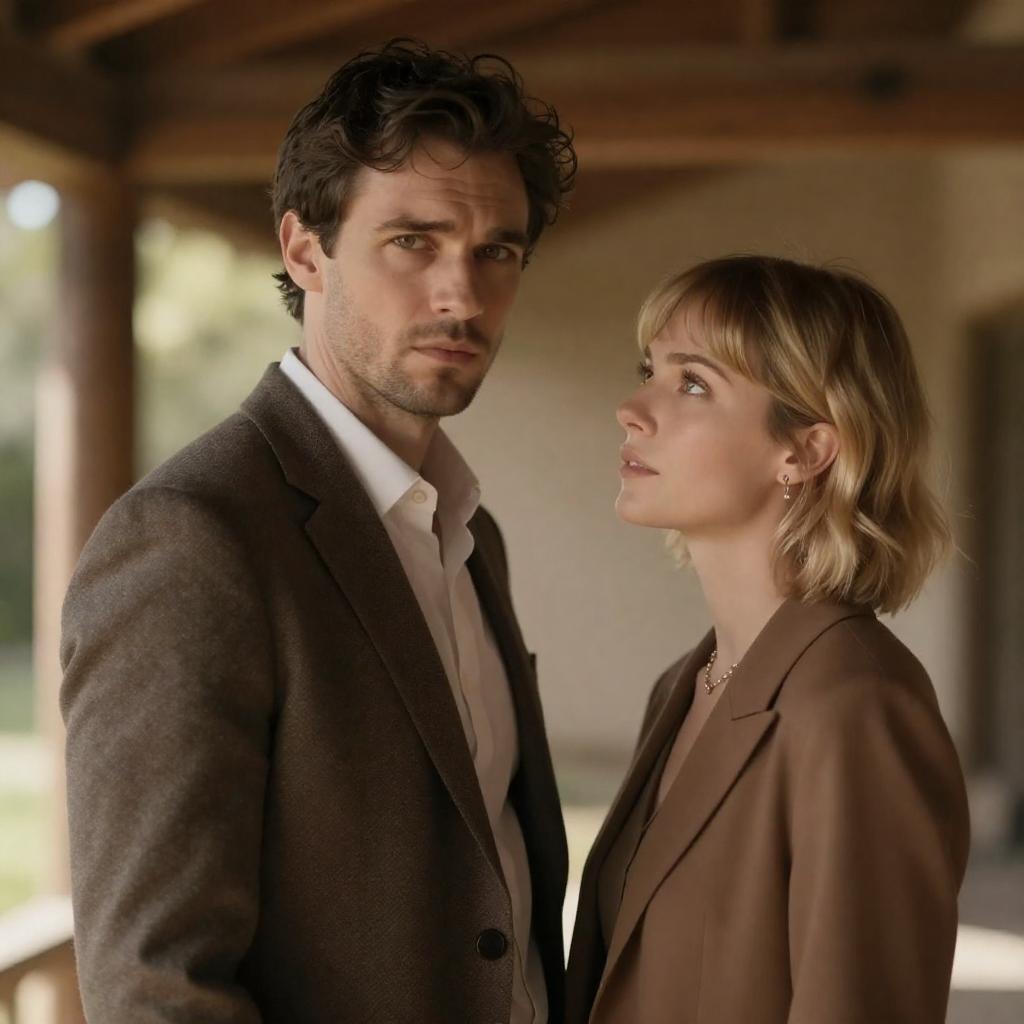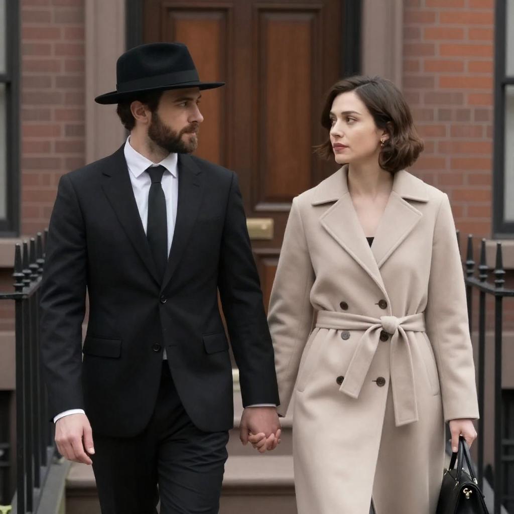Photograph of a man and woman standing on a brick building's porch. The man in a black suit, white shirt, black tie, and black hat with a beard, holds hands with the woman. She has short brown hair, wears a beige coat and black handbag. Both look at each other with neutral expressions. Iron fence, wooden door, and brick walls in the background. Man on left, woman on right.