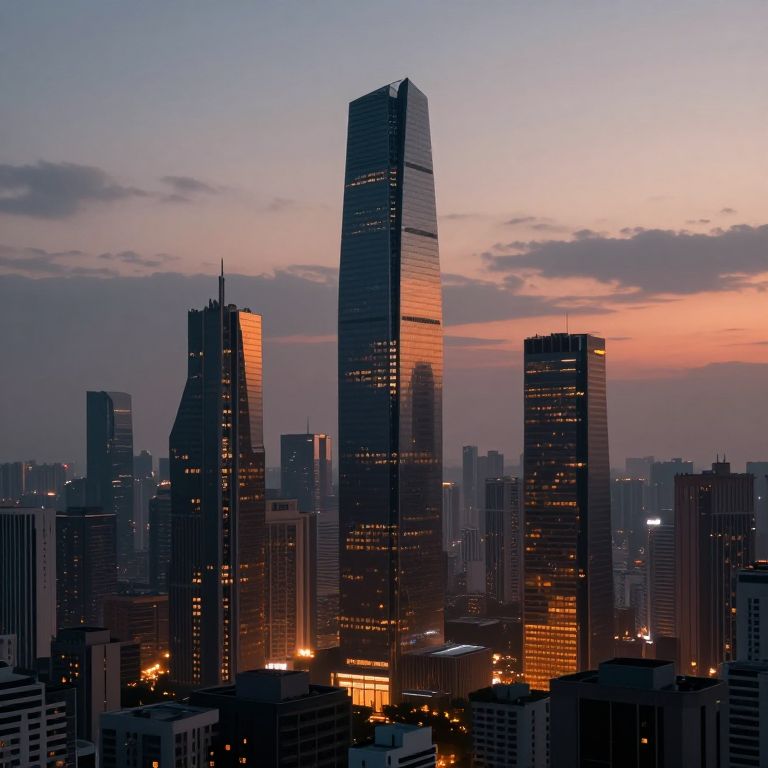 Photograph of a cityscape at dusk, featuring a tall, illuminated skyscraper with a reflective glass facade, surrounded by other darkened buildings, under