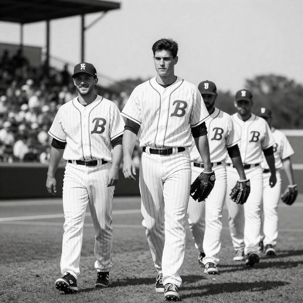 Black and white photograph of two male baseball players in pinstriped uniforms with New York caps. Younger player holds bat, older player looks intently at bat. Both wear caps, standing close, outdoors. Sunlight highlights their faces.