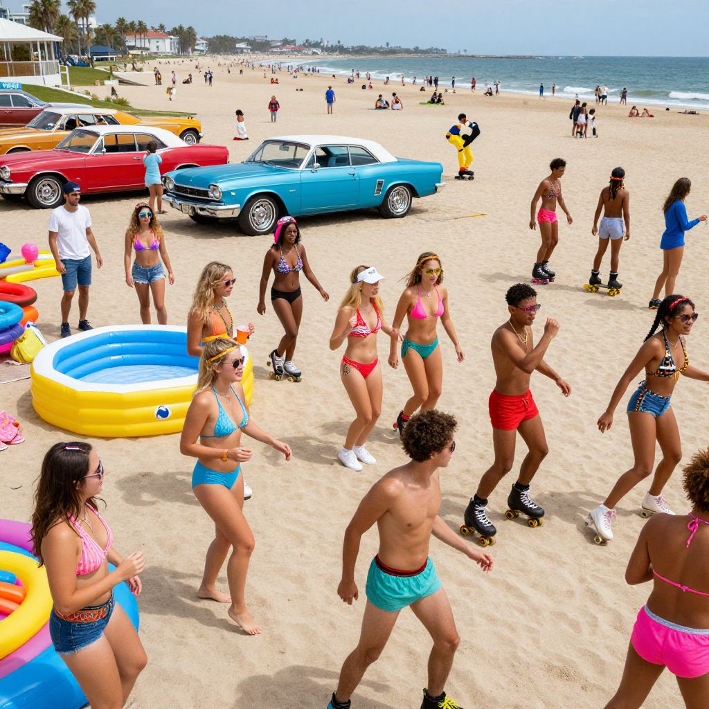 Photograph of a sunny beach scene with diverse group of people in colorful bikinis and swim trunks, rollerblading, and vintage cars parked on