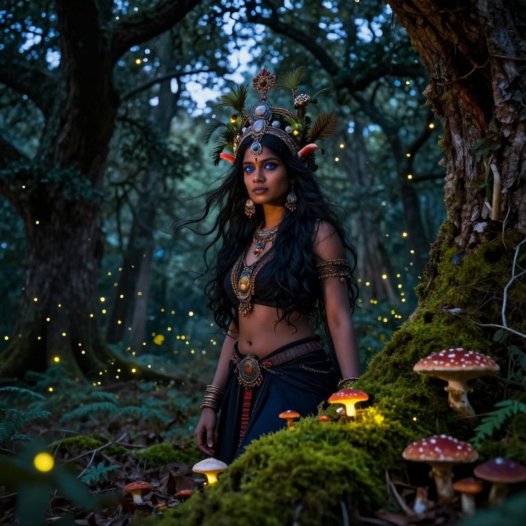 A photorealistic portrait captured with a mirrorless camera showcases a South Asian sorceress enveloped in twilight's ethereal glow amidst an ancient oak forest. Fireflies weave delicate illumination around her, while piercing blue eyes hold secrets whispered by the wind and shadows. Standing with quiet confidence, she is surrounded by vibrant mosses and luminous fungi. The image, framed from an unexpected low-angle perspective, mirrors her power and showcases nature's remnants adorning her intricate headdress—a testament to both her mysterious heritage and deep connection with the untamed wilderness.