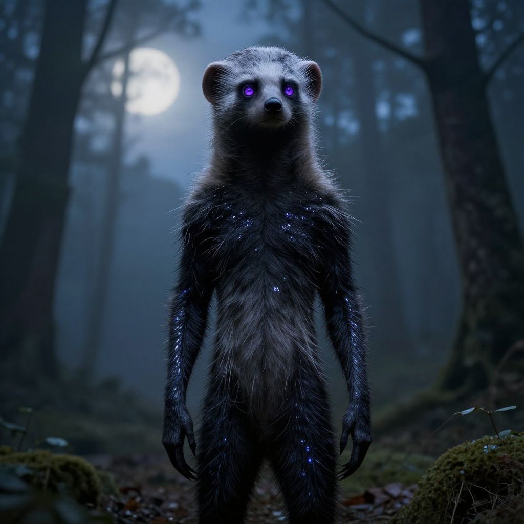 Photograph of a black, glowing-eyed raccoon emerging from a dark, rocky cave, with a dramatic, high-contrast, eerie blue tint.