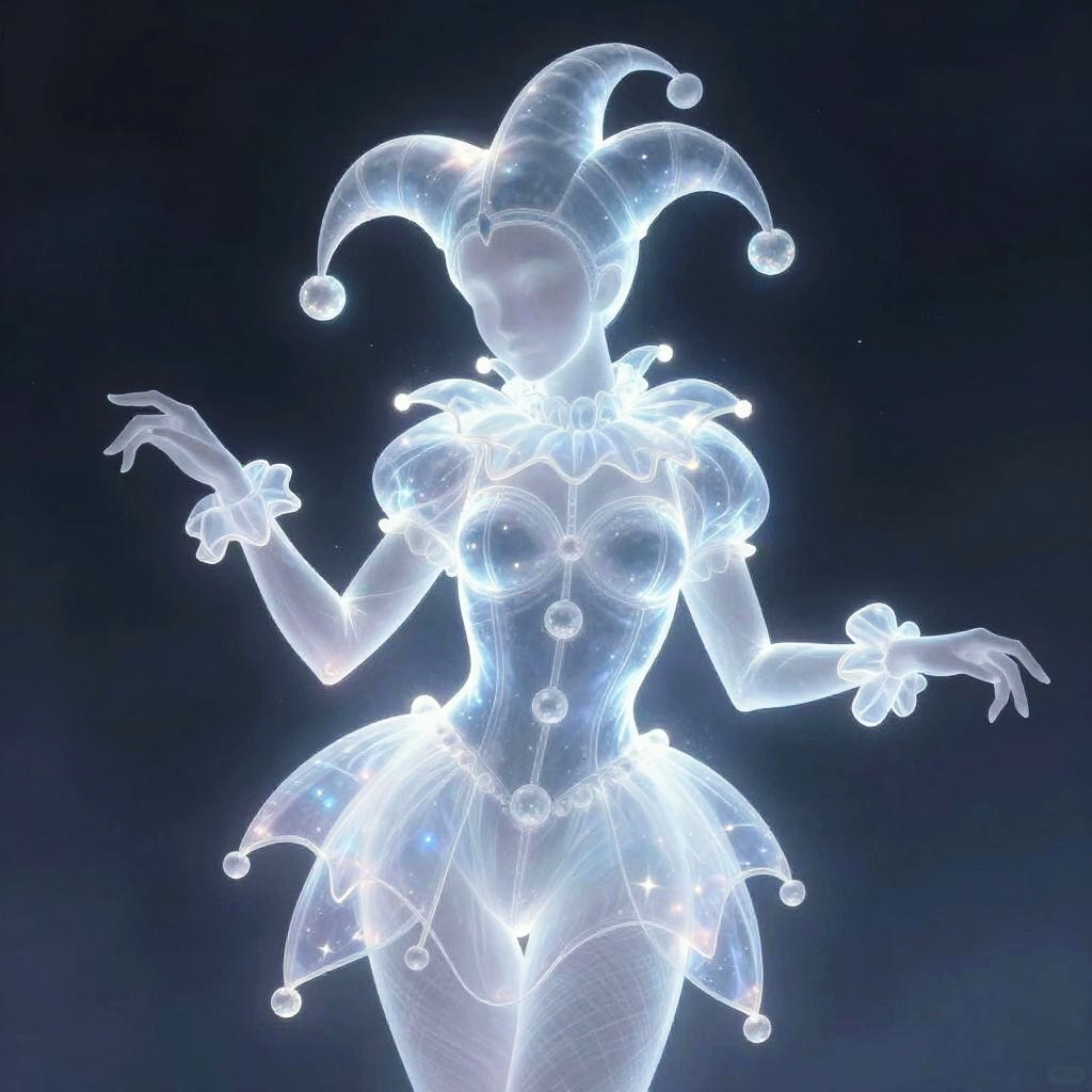Ultra-detailed illustration of the light silhouette of a phantom jester, phantasmagorical figure, (translucent skin:1.6), (translucent body:1.5), neon light, sparkling du