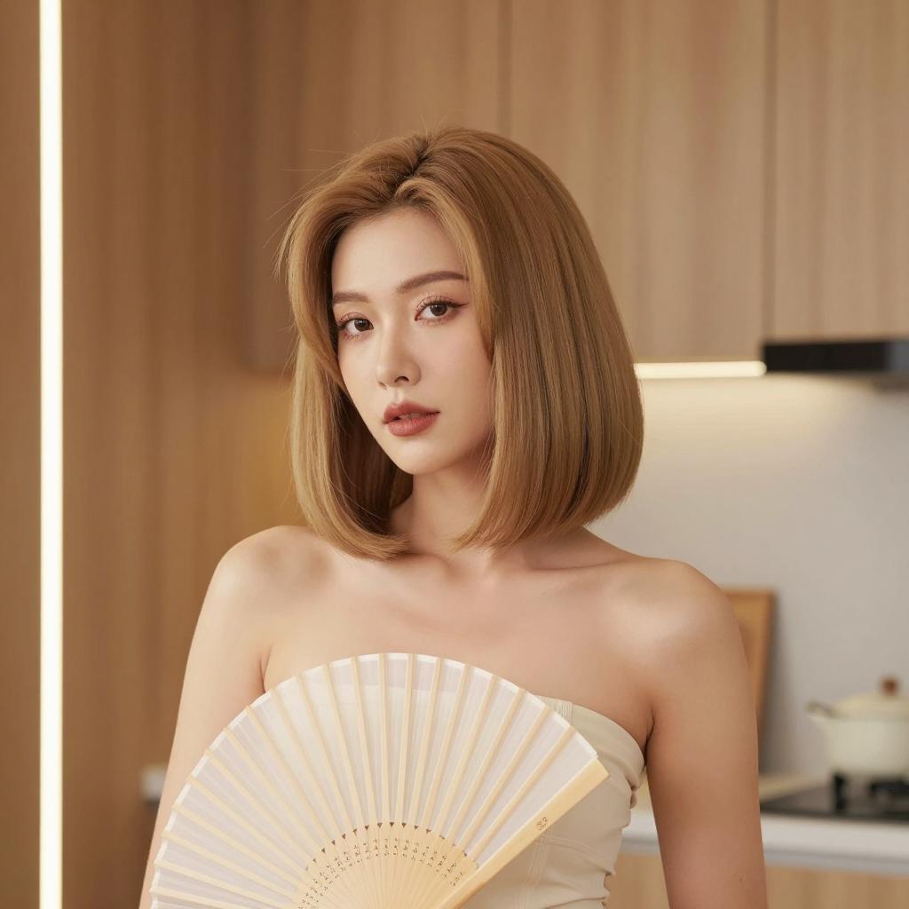 Woman with large, tan, cylindrical hairstyle, wearing a strapless top, holding a white fan with her right hand. Background: wooden walls, kitchen cabinets, and vertical light strip on left. Warm, yellow lighting. Medium shot, front view.