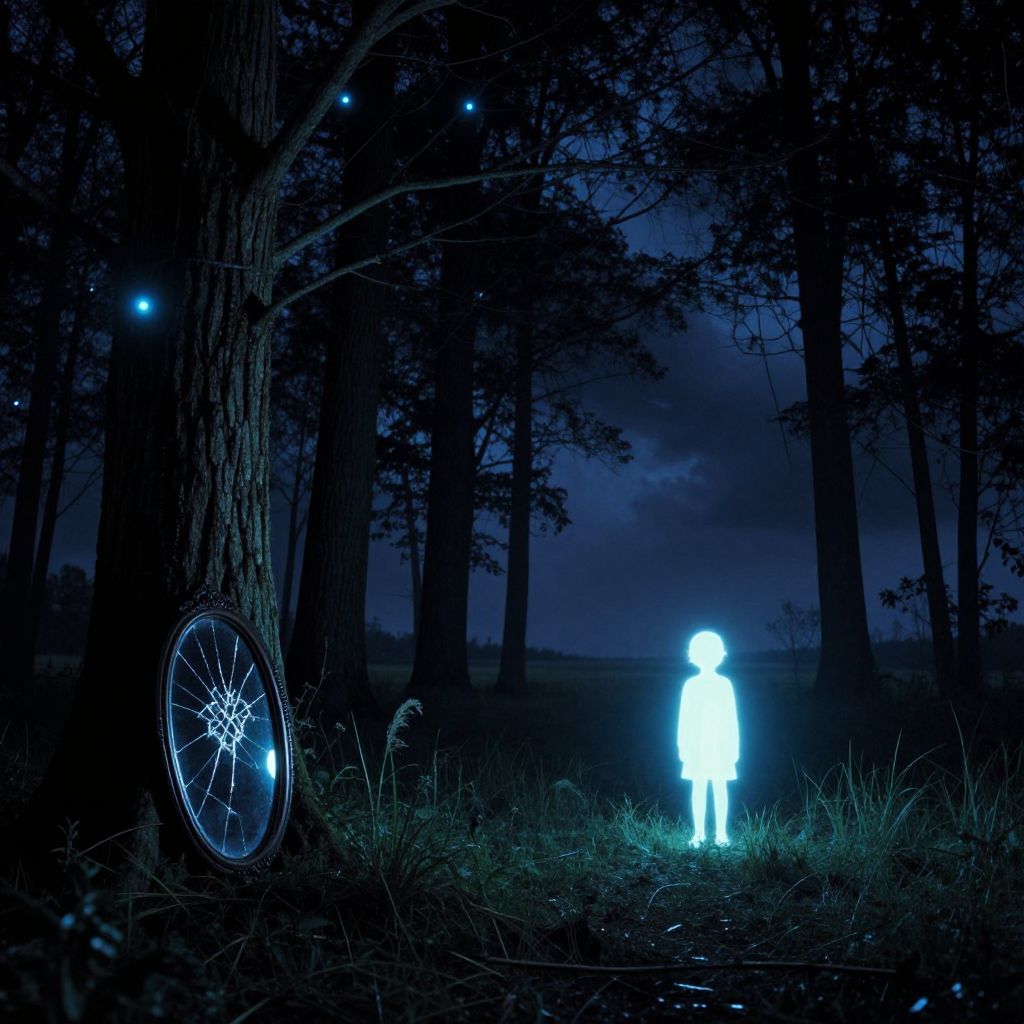 Stranger Things prompt: A mysterious forest at night in the 1980s, with glowy blue lights, a cracked mirror, and a glowing child figure standing at the edge of a stormy field, cinematic atmosphere with a touch of supernatural tension, hyper-detailed, 8K resolution, reminiscent of the original Stranger Things aesthetic.