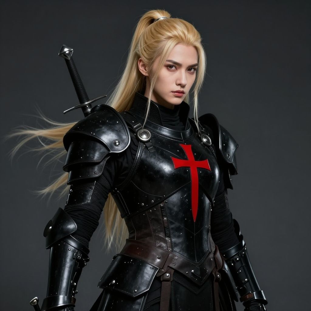 CGI image of a blonde woman in black, glossy medieval armor with a red cross, long ponytail, and sword on back, against a dark