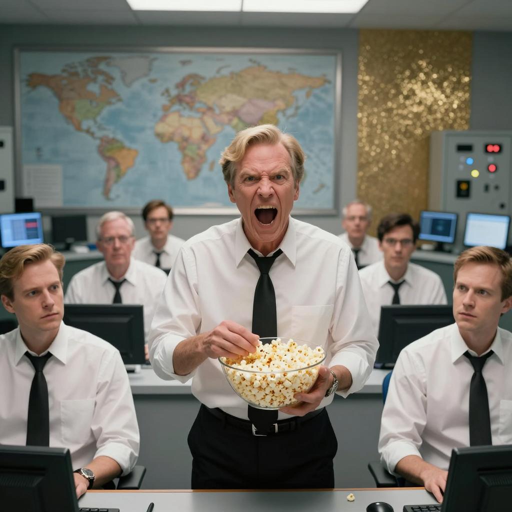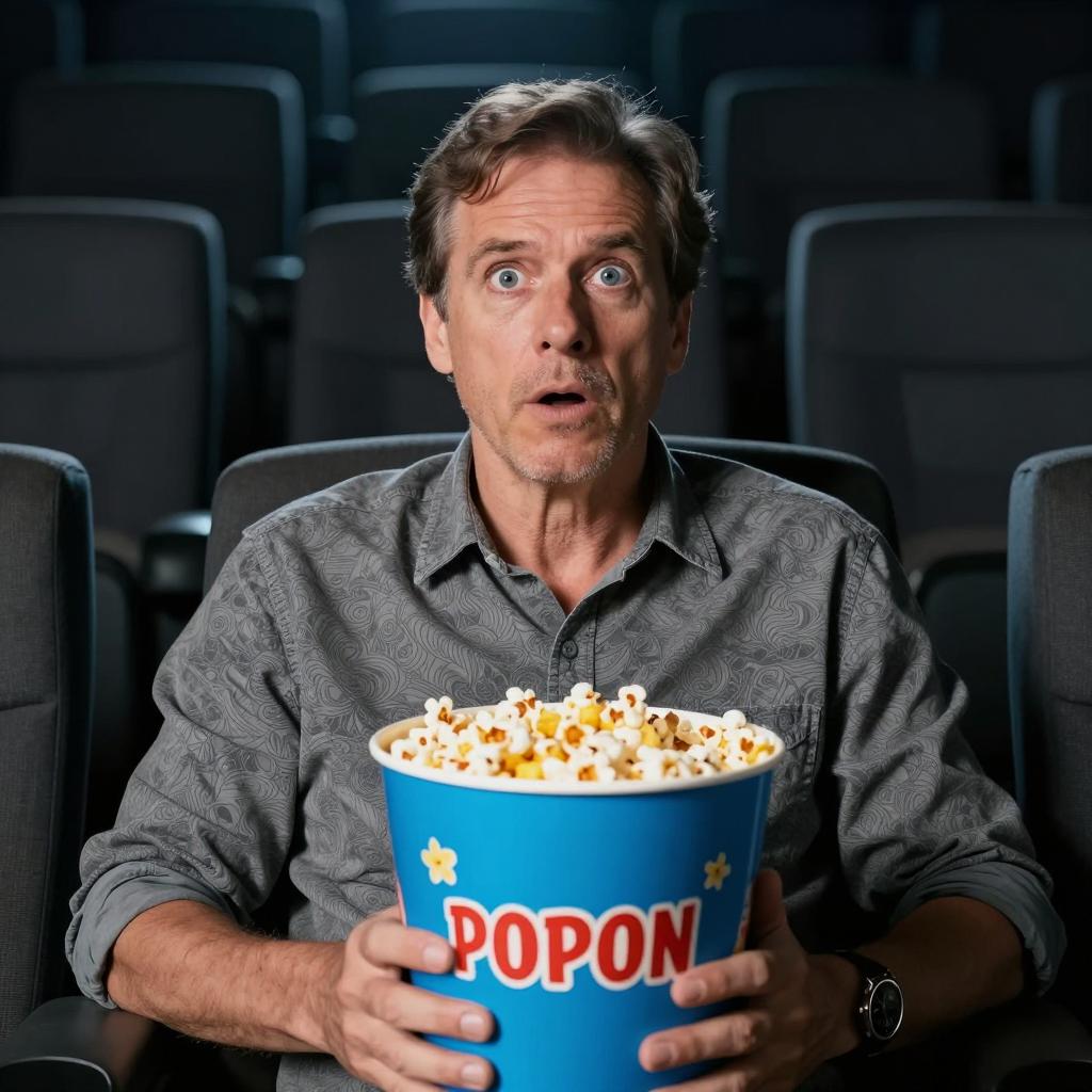 Middle-aged man with short brown hair, wearing a gray patterned shirt, sits in a dimly lit movie theater. He holds a blue popcorn bucket with yellow and white popcorn. His expression is surprised. Dark theater seats and blurry background.