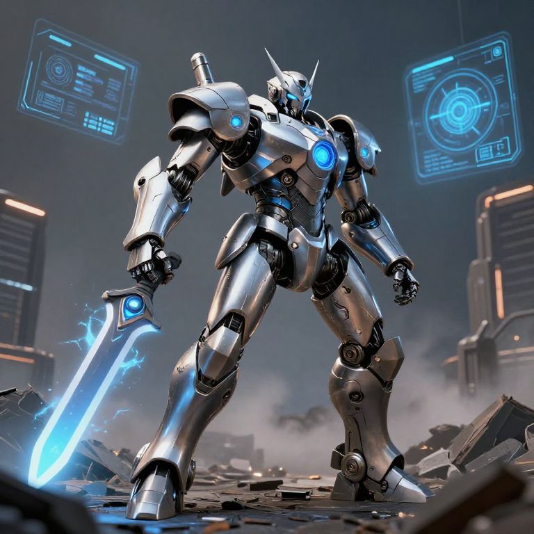 Ironsleek robotic warrior standing on a battle-scarred terrain, polished steel armor with glowing blue accents, dynamic pose with energy sword, cyberpunk background with holographic displays and smoky atmosphere, hyper-detailed digital art style