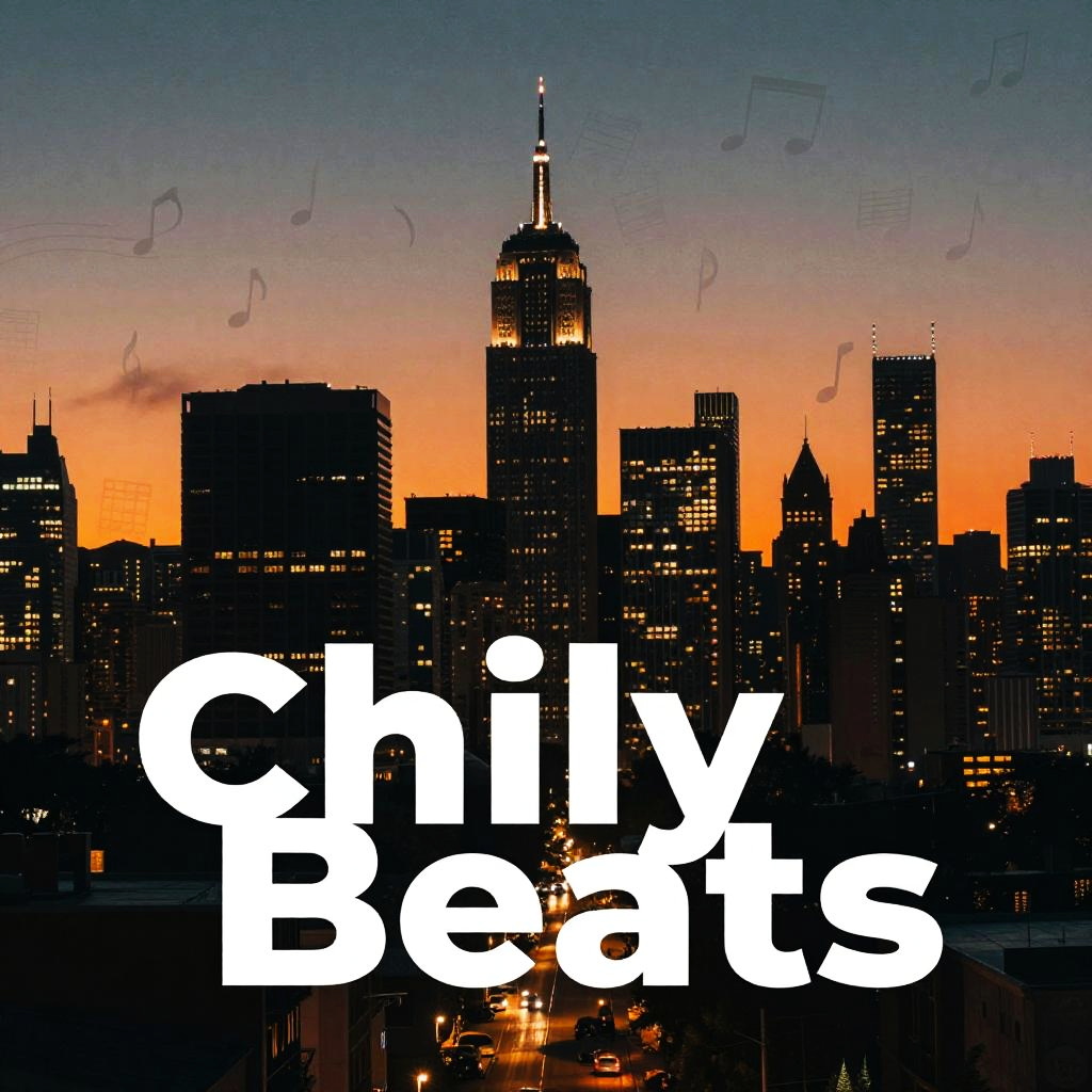 Spotify playlist thumbnail featuring an urban cityscape silhouette at sunset with glowing lights, overlayed with bold typography and subtle music note patterns, cinematic moody ambiance for a chill or lo-fi beats playlist cover.
