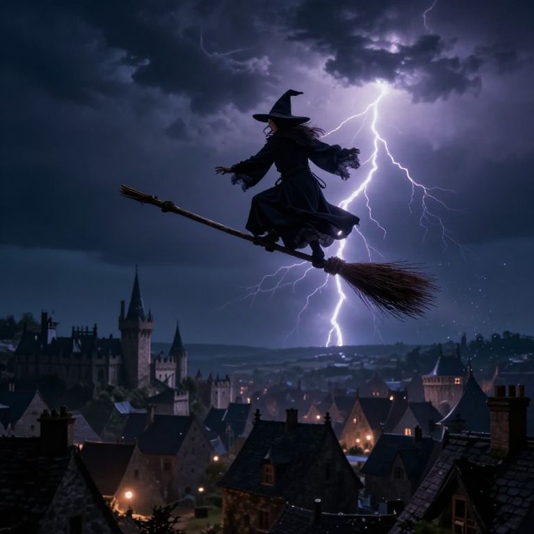 Witches broom stick soaring above a medieval village under a stormy night sky, lightning illuminating the scene, with a witch cloaked in dark robes balancing on the broom, trails of sparkling magic dust following behind.
