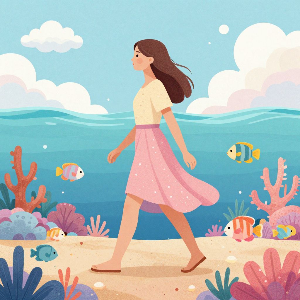 This digital illustration depicts a young woman with long brown hair walking on a sandy beach with a vibrant underwater scene in the background. She wears a white short-sleeved top and a pink, flowing, knee-length skirt with subtle polka dots, and brown sandals. The sky is bright blue with fluffy white clouds. Surrounding her are colorful coral reefs and various tropical fish, including yellow and blue striped, orange and white striped, and blue fish. The water is a gradient of blue shades, and the sand is light beige. The artwork is in a whimsical, cartoon style with bold colors and smooth, clean lines.