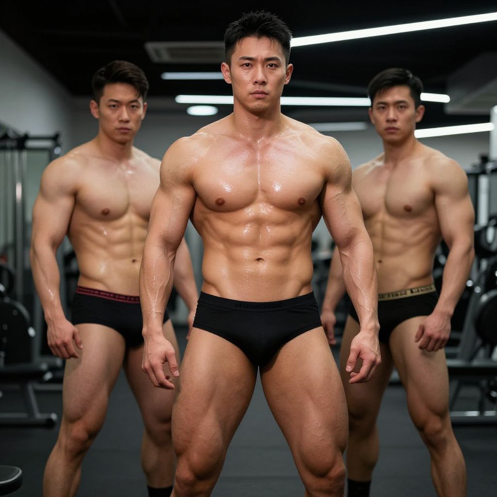 Photograph of three muscular East Asian men in a gym, wearing black briefs, standing in a row with the central man in focus, all g