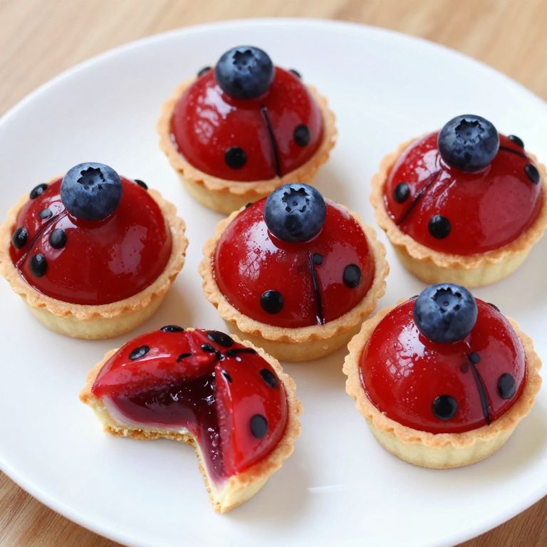 Photograph of five mini red fruit tarts on a white plate, each shaped like a ladybug with black dots and topped with a single black blueberry. The tarts have a bright red fruit filling with a smooth, glossy texture, and a light beige crust. One tart in the bottom left has a slice cut out, revealing the filling. The background is a wooden surface.