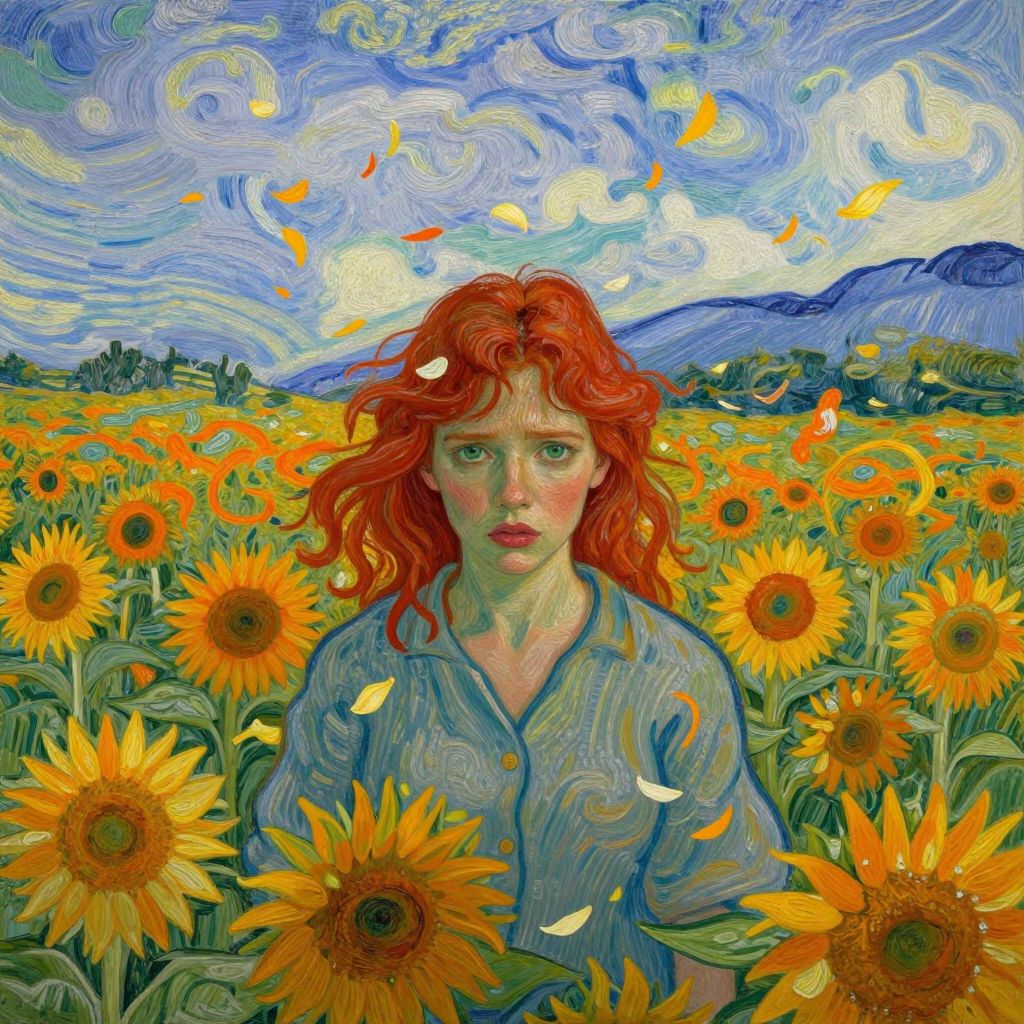 An enigmatic portrait in the style reminiscent of Van Gogh's swirling brushstrokes and vivid colors, depicting a young woman with vibrant red hair and piercing green eyes. Captured from an aerial perspective amidst a whirlwind of colorful petals, her expression reflects a mix of determination and melancholy, standing amidst blooming sunflowers against a tumultuous sky. The scene is painted with vibrant strokes of yellow, orange, and blue in an emotional gradient that evokes both hope and despair, set against the backdrop of a vast field under an expressive, ever-changing sky.