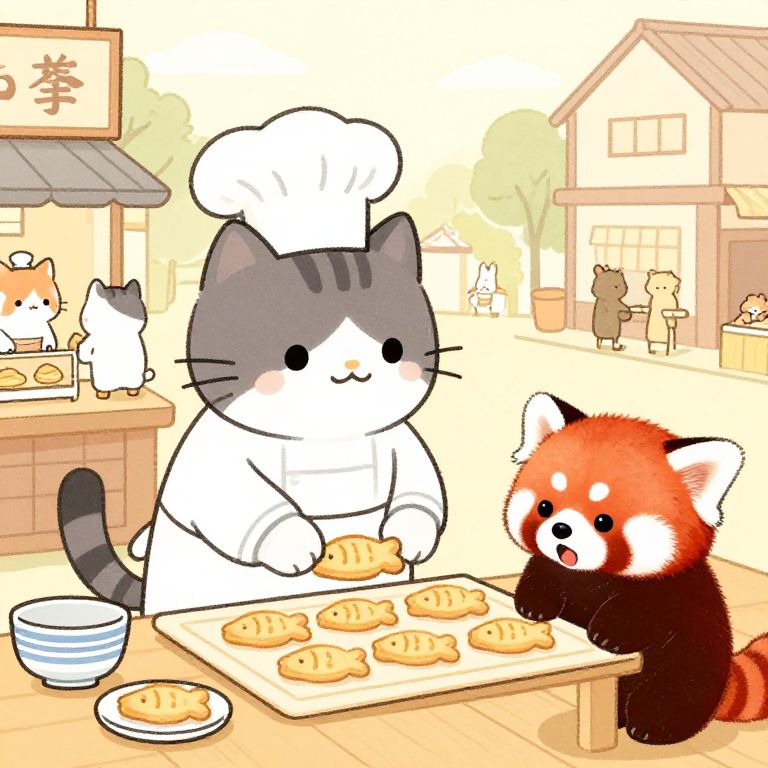 Portrait in a busy animal town, a cat baker is baking fish biscuits for an impatient red panda, anthropomorphic cute animals, old japanese line art,