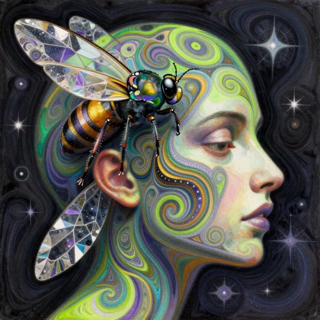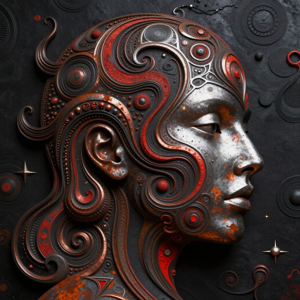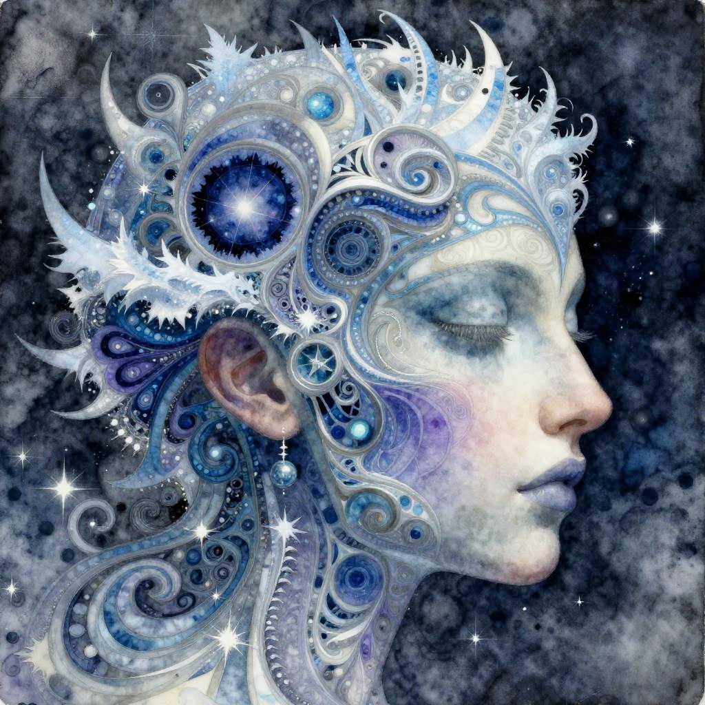 A vibrant, abstract portrait blending robotic humanoid with crystalline and desert elements, glass etching effect, swirls of amber, sand, steel blue, and ivory come together to form a side profile of a face, the image exudes a psychedelic, dream-like quality with intricate patterns reminiscent of art nouveau intertwined with celestial motifs on a dark, textured background