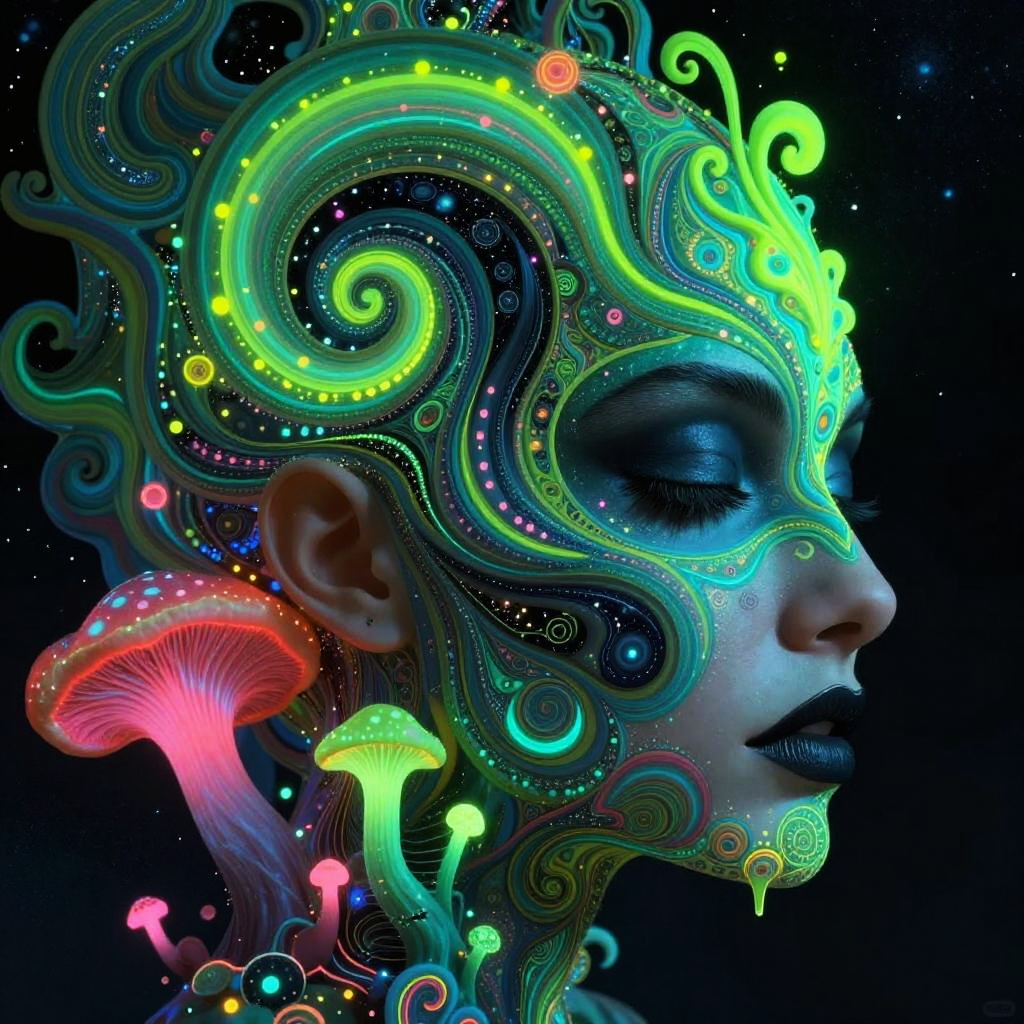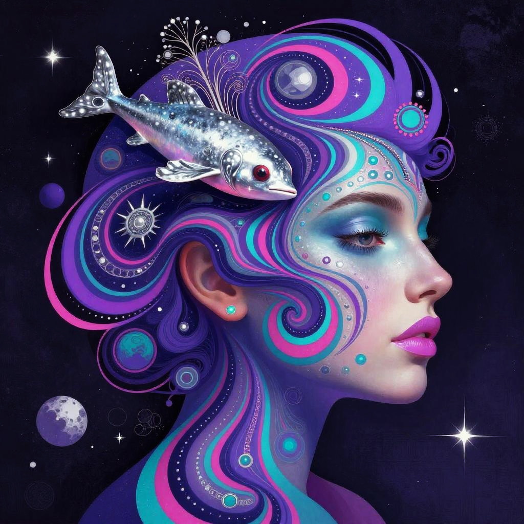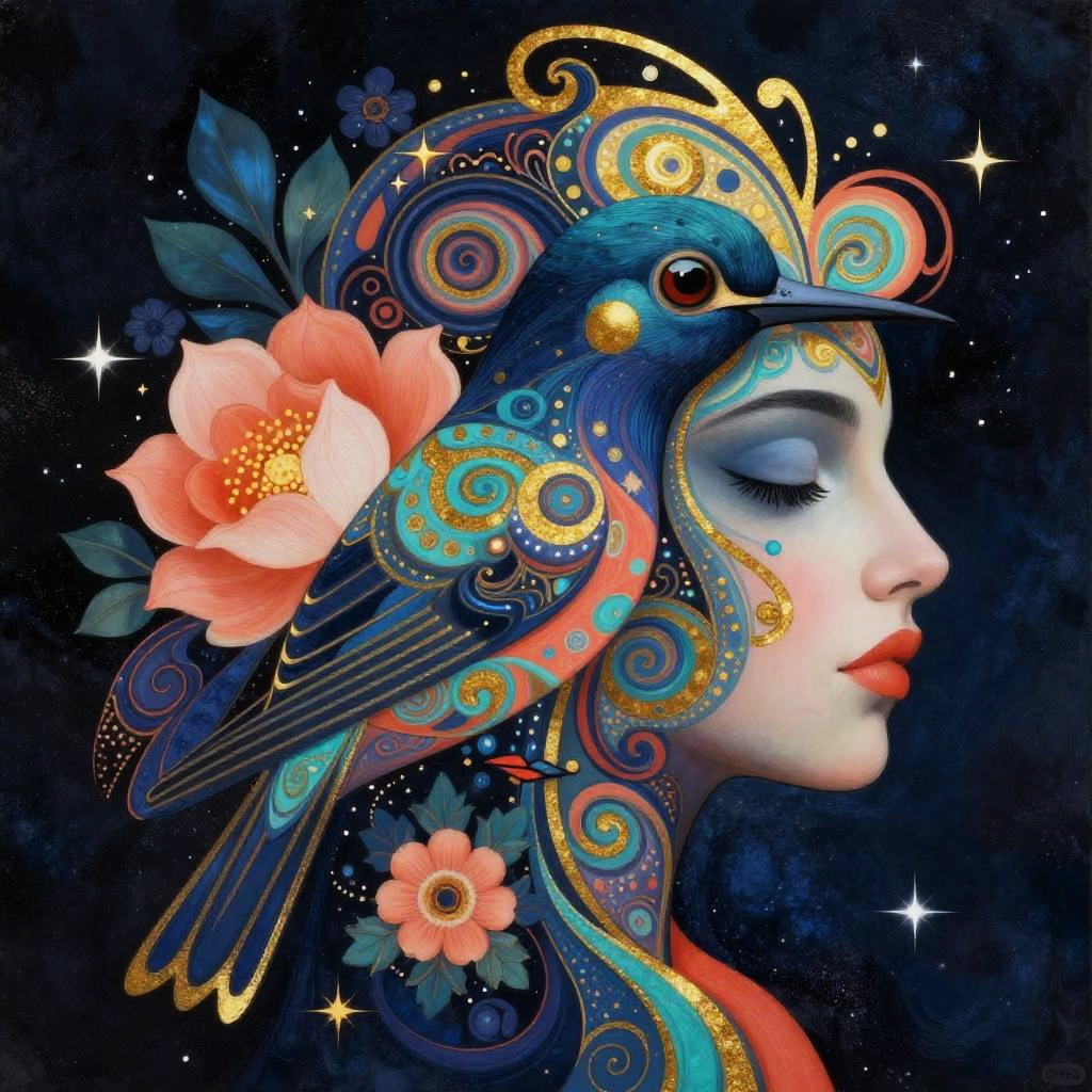 A vibrant, abstract portrait blending robotic humanoid with crystalline and desert elements, glass etching effect, swirls of amber, sand, steel blue, and ivory come together to form a side profile of a face, the image exudes a psychedelic, dream-like quality with intricate patterns reminiscent of art nouveau intertwined with celestial motifs on a dark, textured background