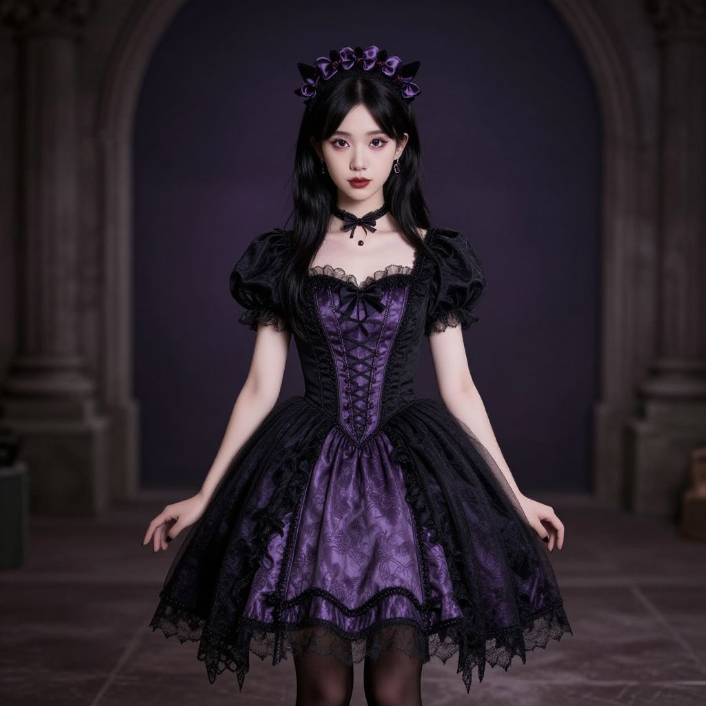 This is a digitally created image of an East Asian woman with pale skin and long, straight black hair, wearing a gothic Lolita dress. The dress is black with a deep purple lace overlay, featuring puffed short sleeves and a corset-style bodice with intricate lace detailing. She wears a black choker with a small pendant and a black lace headpiece with small bows. Her makeup is dramatic, with dark red lipstick and dark eye makeup. She stands in a dimly lit, arched stone hallway, with the background blurred to focus on her. The image has a high-contrast, dark purple and black color scheme, emphasizing a gothic, mysterious atmosphere.