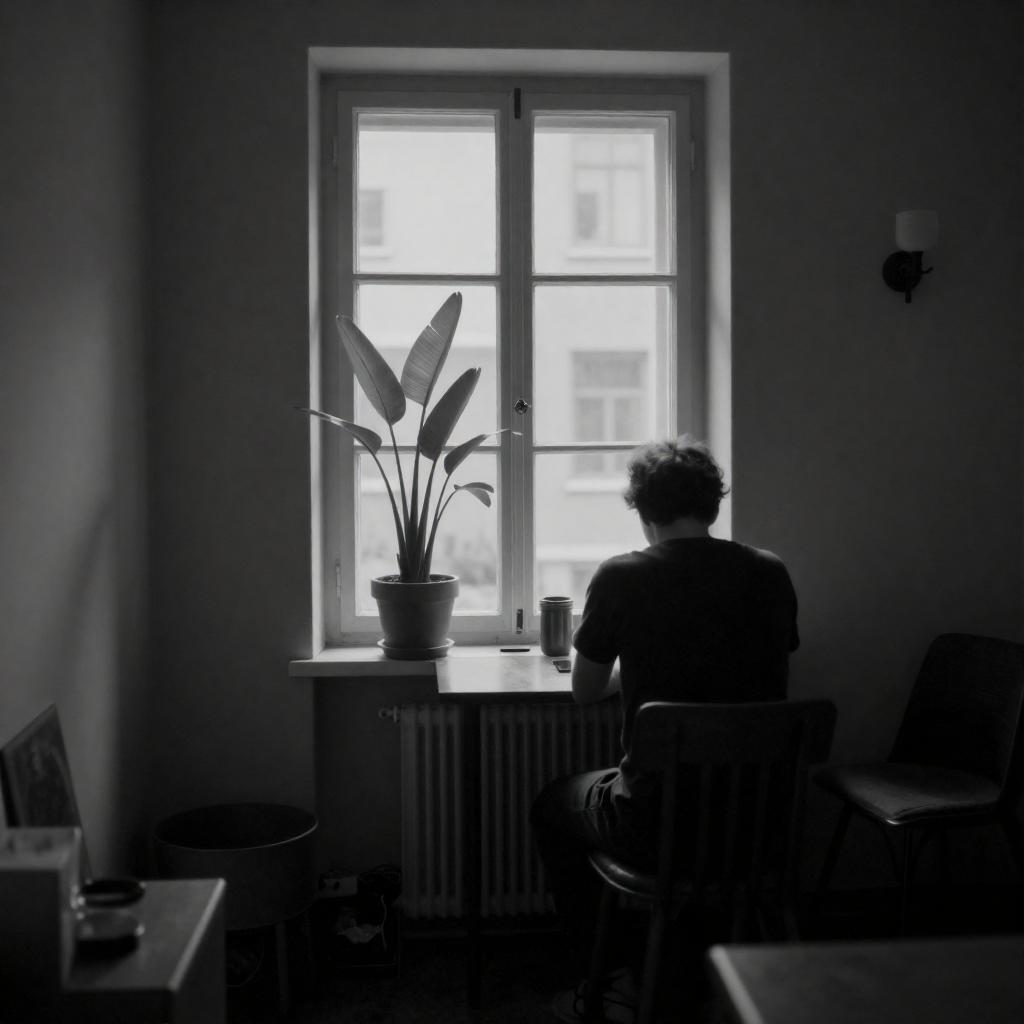 Black and white photograph of a dimly lit room. Single person with short hair, wearing a dark shirt, sits at a table by a window. Large potted plant with tall leaves in front. Window open, outside view partially visible. Wall sconce on right. Shadows and soft light create a moody atmosphere. Various objects and clutter on left.
