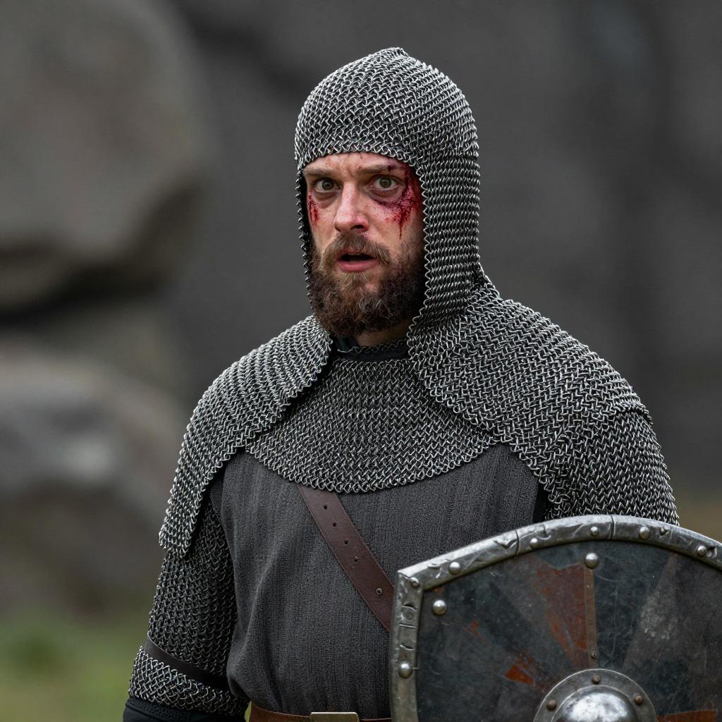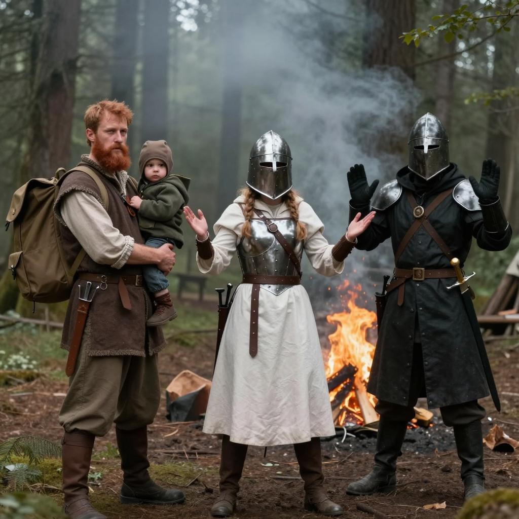 Photograph of a medieval scene. Knight with chainmail and white apron, back to camera, facing elderly man with long white beard, fur cloak, and glasses. Burning wooden structure in background, smoke rising, red embers visible. Knight's hand on sword hilt, elderly man holding cup. Misty atmosphere, broken wooden beams. Knight's stance dominant, elderly man crouched.