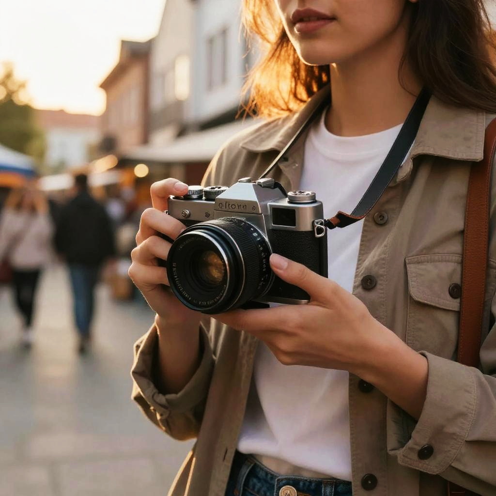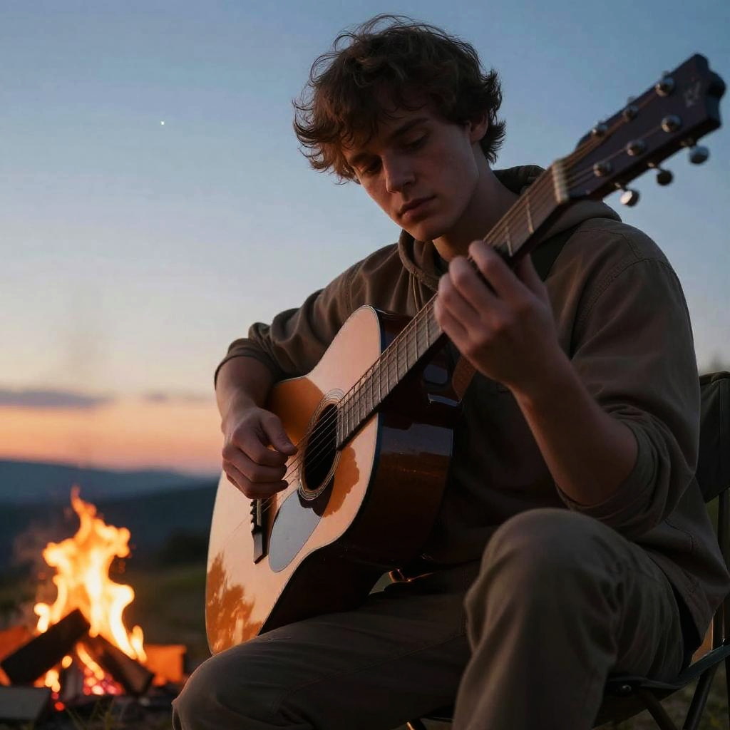 Close-up photo of youthful man's hands playing an acoustic guitar, set in cozy campfire scene under a starlit sky, hyper-realistic details, wide and low-angle shot with realistic sunset lighting.