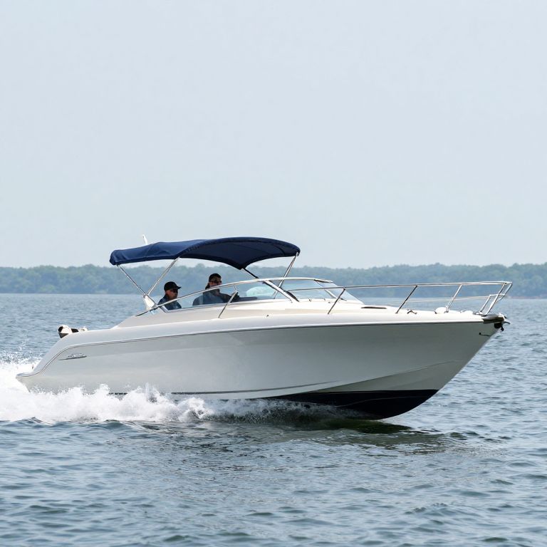 Chris-Craft Launch 25 GT speeding gracefully across calm waters in Bridgeport, New York, with two individuals enjoying the ride under its sleek canopy.
