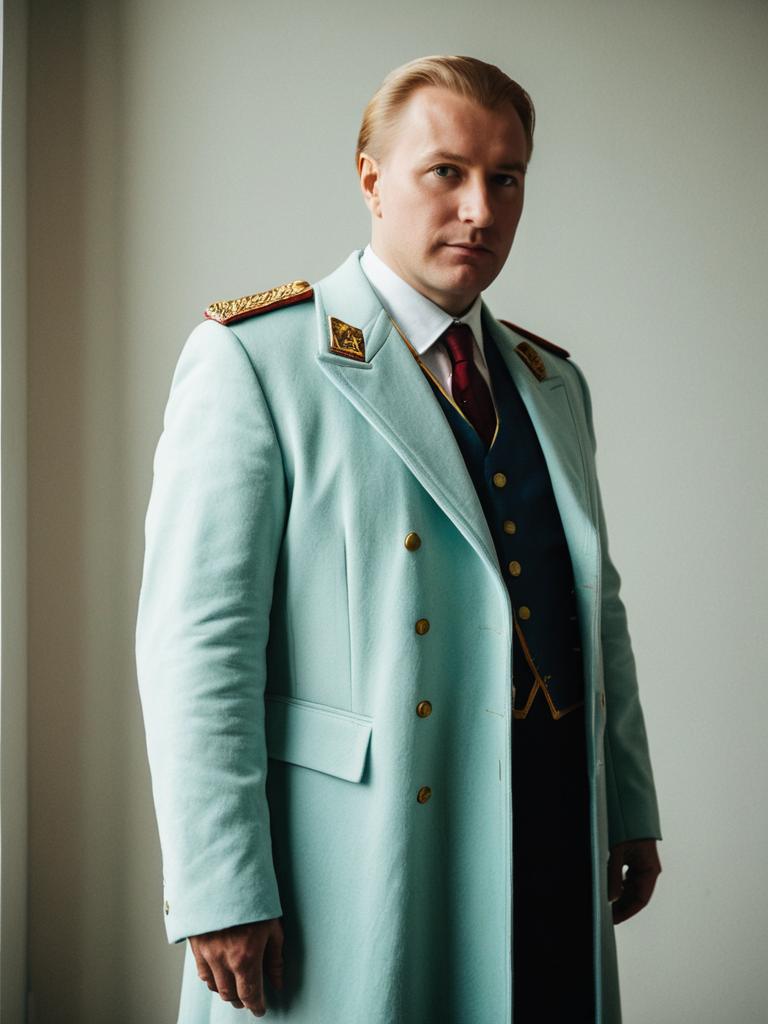 Portrait of a man wearing a detailed Yevgeny Borisovitch Volgin cosplay costume, featuring a light blue double-breasted coat with gold buttons and shoulder insignias, a white shirt, a red tie, and a dark blue vest with gold accents. The realistic photo captures the subject with light skin and blonde hair, styled to replicate the character's appearance.