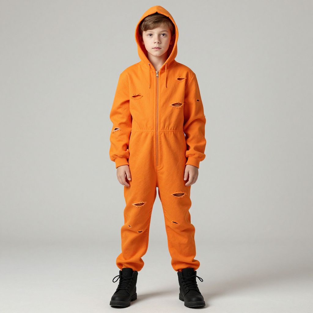 Holes orange jumpsuit, solo, jumpsuit, orange jumpsuit, 1boy, male focus, hood, standing, full body, black footwear, aura, hood up, shoes, indoors