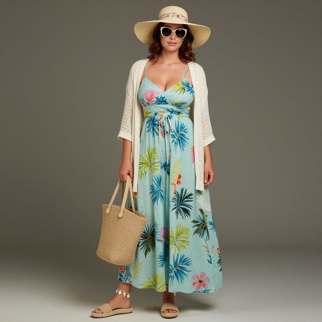 Full body shot, Busty woman, vibrant polka dot beachwear dress, lightweight cotton fabric, knee-length hem, flared skirt, fitted bodice, adjustable spaghetti straps, sweetheart neckline, playful ruffles along the hem, bright colors, white and navy dots, cinched waist, matching wide-brimmed sun hat, oversized sunglasses, strappy sandals, beach tote bag, sun-kissed skin, carefree summer vibe Sexy. Pretty face and beаutiful eyes. Big breasts