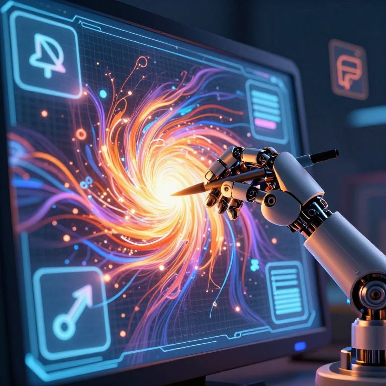 Image generator depiction, a robotic arm painting vivid images on a digital screen with flowing brushstrokes of light, surrounded by floating icons of design tools, cybernetic and sci-fi style, rich textures with luminous effects