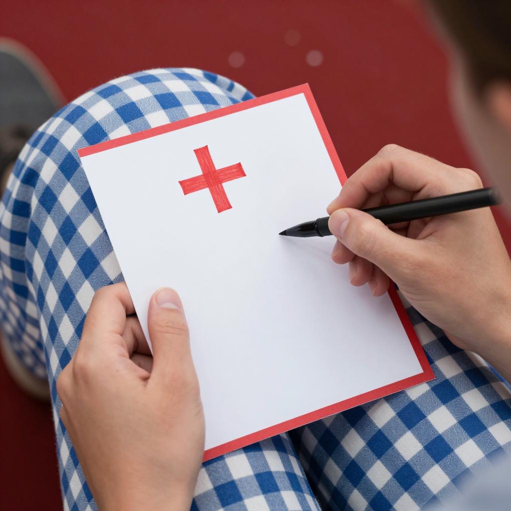 Hands writing on a white note with red border, red cross at top, in black ink. Note in lap of person wearing blue and white checkered pants. Person's arms visible, left hand holding note, right hand writing. Background has red carpet with white specks. Upper left shows part of another person's arm in gray sleeve.