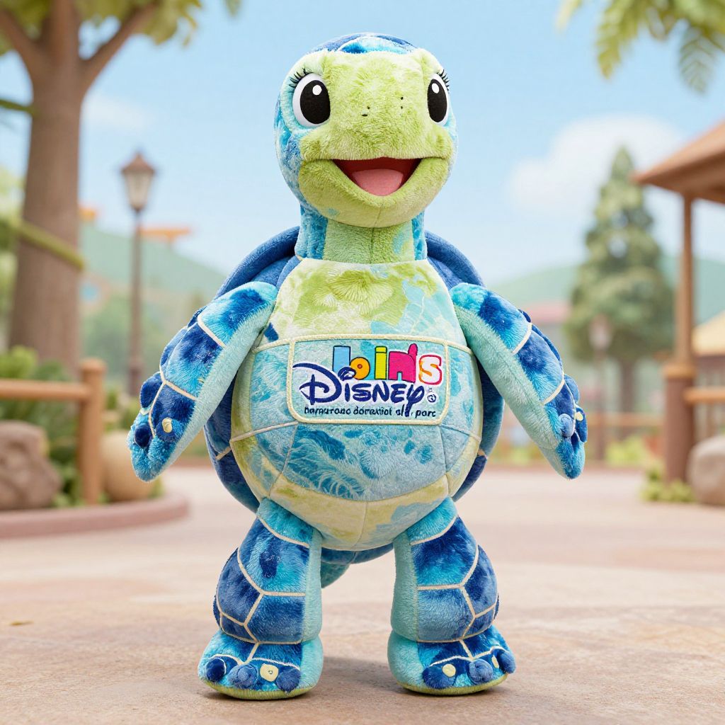 "Op Art full lenght standing sea turtle plush mascot adult costume smiling with oceanian tatto disney style pixar violet and blue degraded kids happy in attraction disneyland parc,"
