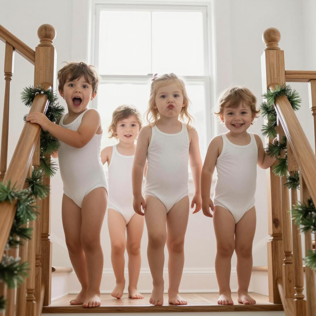 Four young children with light skin, dressed in white one-piece outfits, standing on a wooden staircase. Two boys are positioned on the left and right sides, with two girls standing in the middle. The boy on the left has an open-mouthed expression, the girl in the center shows a pouty look, and the boy on the right is smiling. The staircase is decorated with green garlands on both sides, and a bright window illuminates the background.