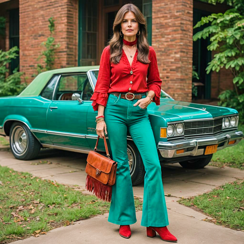 A woman with straight brown hair dressed in a 1970s retro outfit, including bell-bottom emerald green pants, a crimson tie-dye linen shirt, and a red suede fringe vest, posing outdoors while leaning against a vintage red car. She accessorizes with red earrings, a gold watch, rings, and platform shoes, standing on a grassy lawn in front of a rustic house surrounded by greenery.