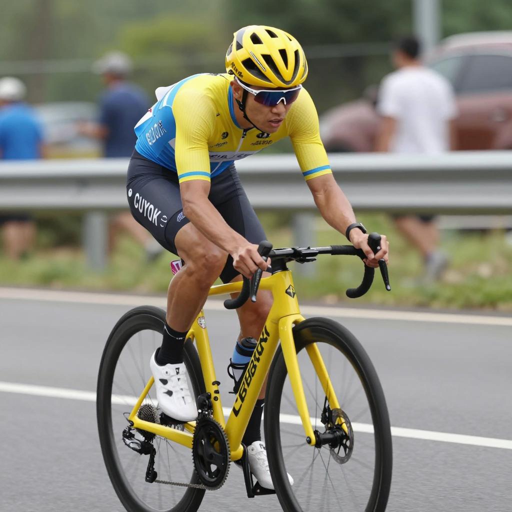 Cyclist in mid-race, leaning forward, gripping handlebars, wearing yellow and blue jersey, black shorts, yellow helmet with stripes, intense expression, blurred background, yellow bicycle frame, motion blur, focused, determined.