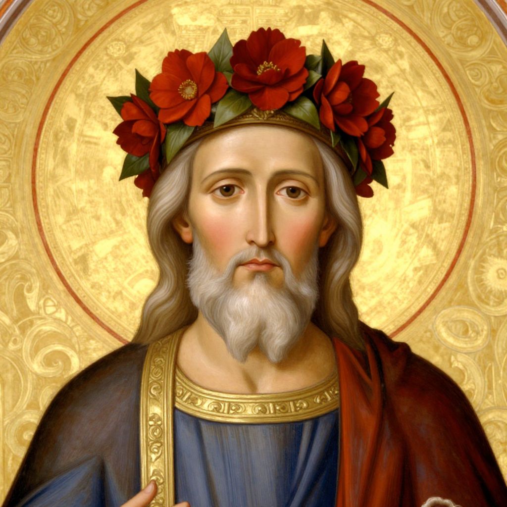 King Ravinger depicted as a heroic figure in stained glass style, holding a scepter with a radiant gem, set within a grand cathedral window, medieval fantasy theme