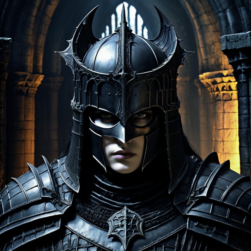 Close-up portrait of a young knight wearing detailed, dark gothic armor and a horned helmet. The knight has a haunting, intense gaze with pale skin and dark hair. The background features ancient, ruined gothic stone arches with dramatic cinematic lighting.