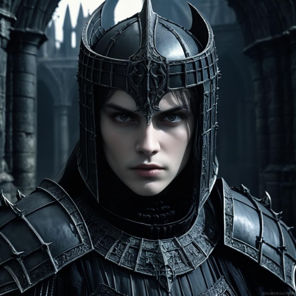 Dark Souls knight, close portrait with haunting gaze, gothic ruins background. Created by H.R. Giger with cinematic lighting by James Gurney.