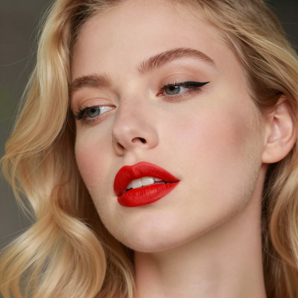 Close-up photograph of two women with identical facial features, lying side by side. Both have light blonde hair, thick black eyebrows, winged eyeliner, and full pink lips. Their eyes are half-open, gazing to the left. The women's heads are touching, with their lips slightly parted. The background is dark and out of focus.