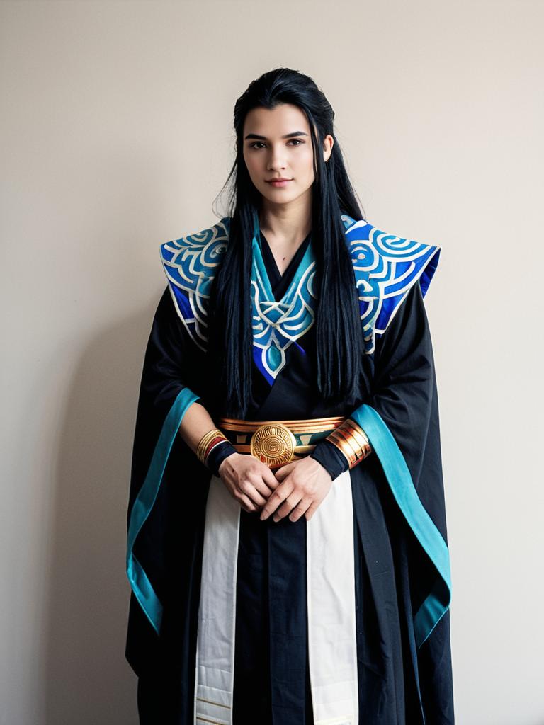 Full-body portrait of a young man indoors wearing a white shirt with puffy long sleeves, tucked into high-waisted brown pants. He has black hair styled in a topknot and accessorizes with a beaded necklace and bracelets. He is standing confidently wearing brown lace-up boots. The setting appears to be an office or study room with furniture and a person working in the background.