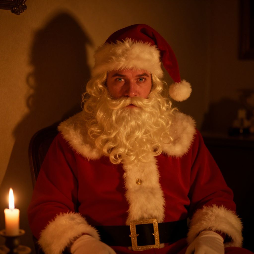 Intimate, dimly lit scene: A man, dressed in a vintage Santa suit, sits comfortably amidst a cozy atmosphere, surrounded by soft candlelight, casting warm, golden hues across his face. Shadows dance across the walls, adding an air of nostalgia and whimsy to this enchanting setting. The subject's kind eyes twinkle with warmth Man has masculine face and piercing eyes