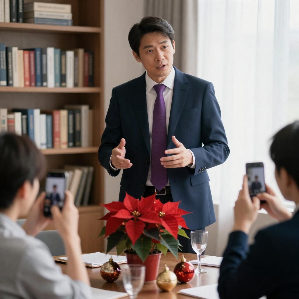 Photograph of a man in a dark blue suit, white shirt, and purple tie standing at a table, gesturing with hands. Background has a bookshelf with books. Table has red poinsettias, ornaments, and a glass. Three other people seated at table, one taking a photo. Bright light from window. Intense expression on man's face.