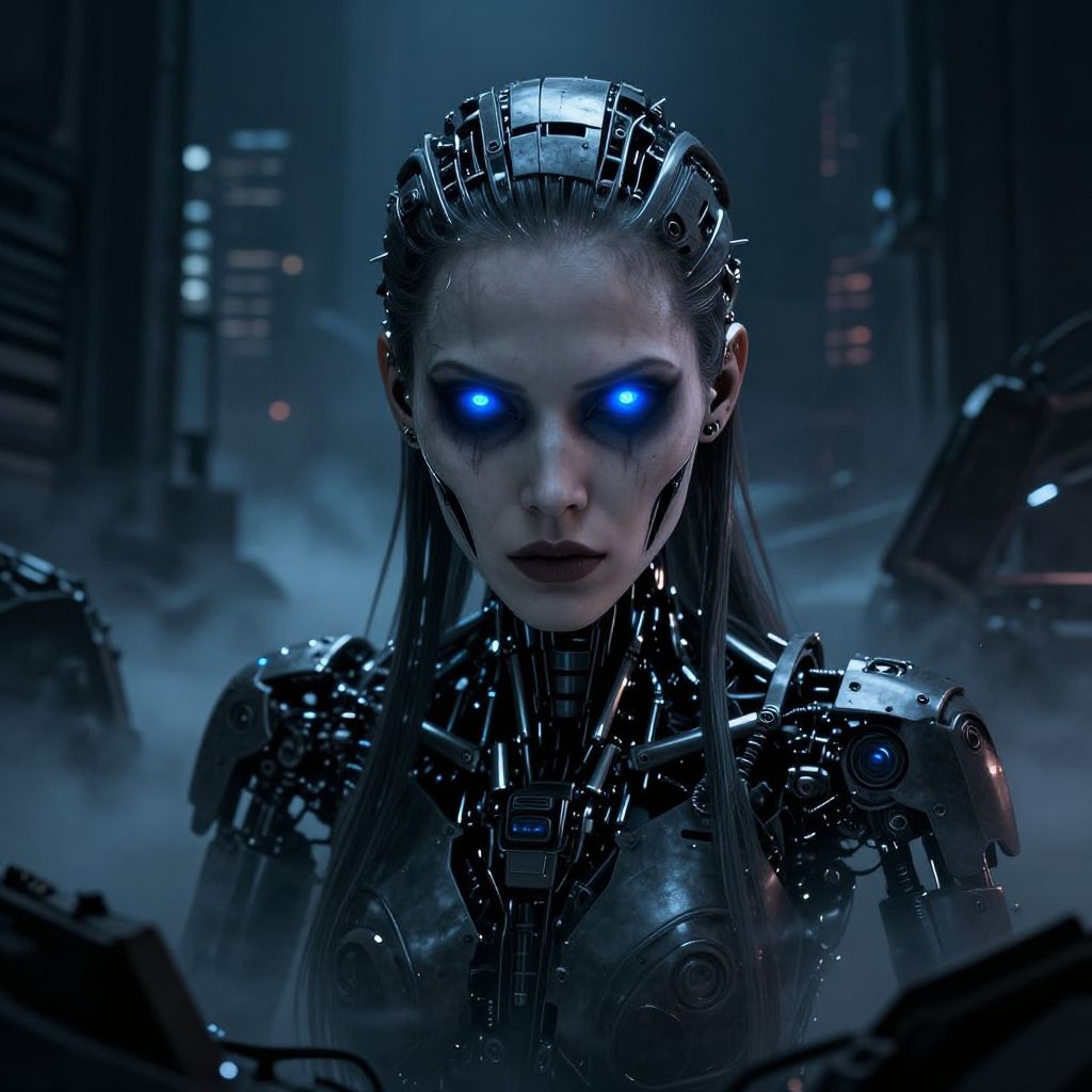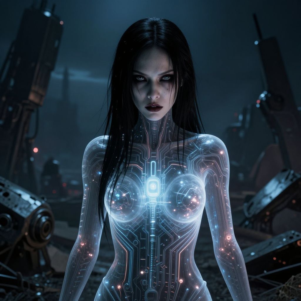 Scary AI woman with translucent skin revealing glowing internal circuits, standing in a post-apocalyptic landscape with shattered machines around, intense stare and eerie vibe, cinematic lighting and high detail, dark futuristic horror.