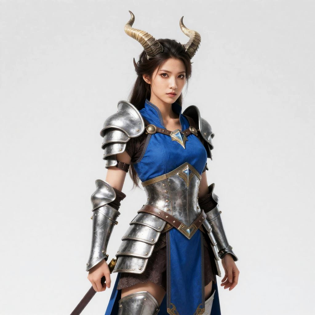 Photograph-style digital artwork of a young woman with long black hair, wearing a blue, form-fitting tunic and silver, metallic armor that covers her shoulders, arms, and thighs. She has a determined expression on her face and is adorned with large, curved horns on her head. The armor features intricate designs and a brown leather belt with a golden clasp. She stands against a plain white background, emphasizing her fantasy warrior appearance. Her skin tone is light, and her eyes are dark brown, adding to her fierce look. The image is highly detailed, with a focus on the textures of the armor and fabric.