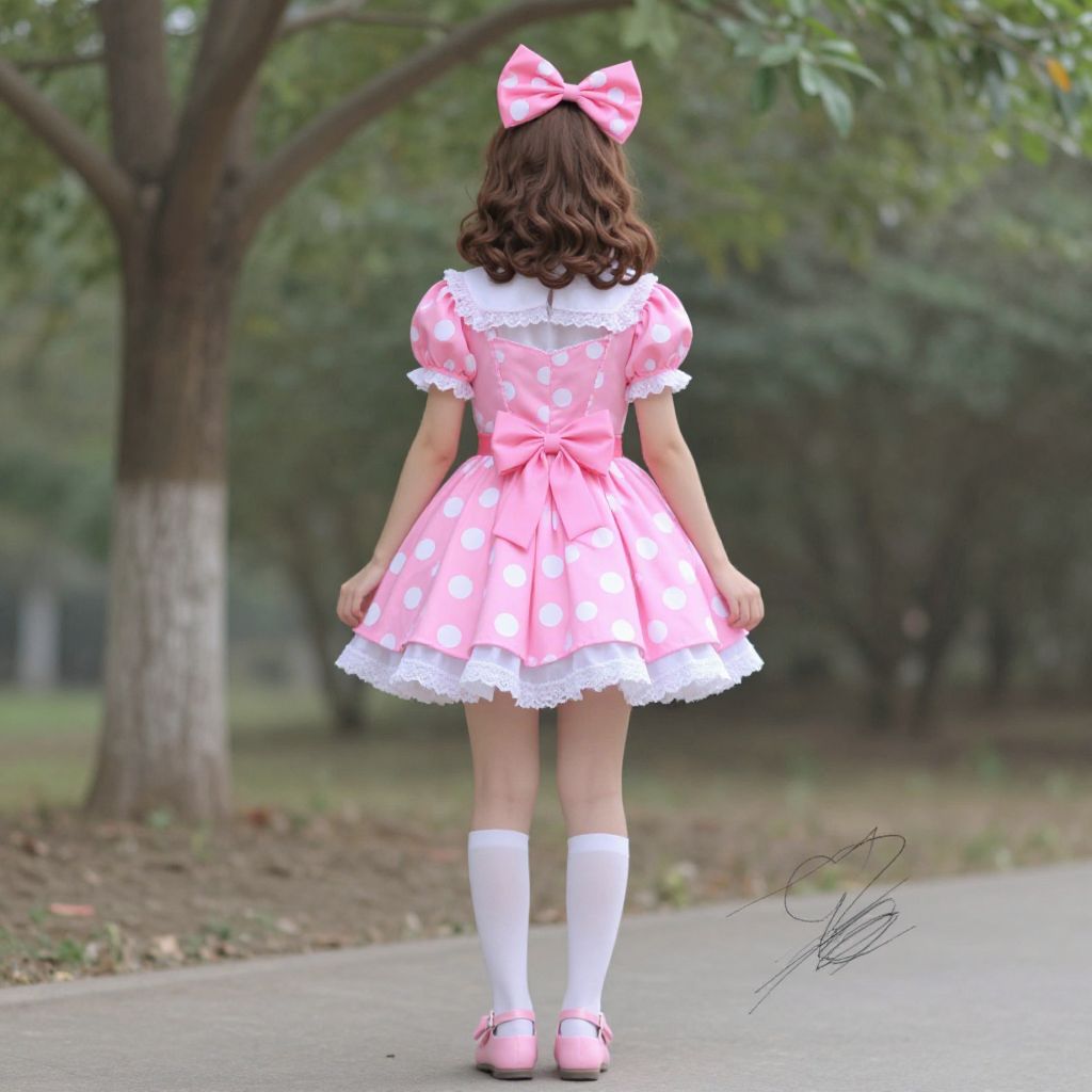 Pink sweetheart costume, 1girl, solo, dress, brown hair, polka dot, outdoors, polka dot dress, bow, blurry, shoes, tree, pink bow, full body, pink dress, hair bow, sketch, day