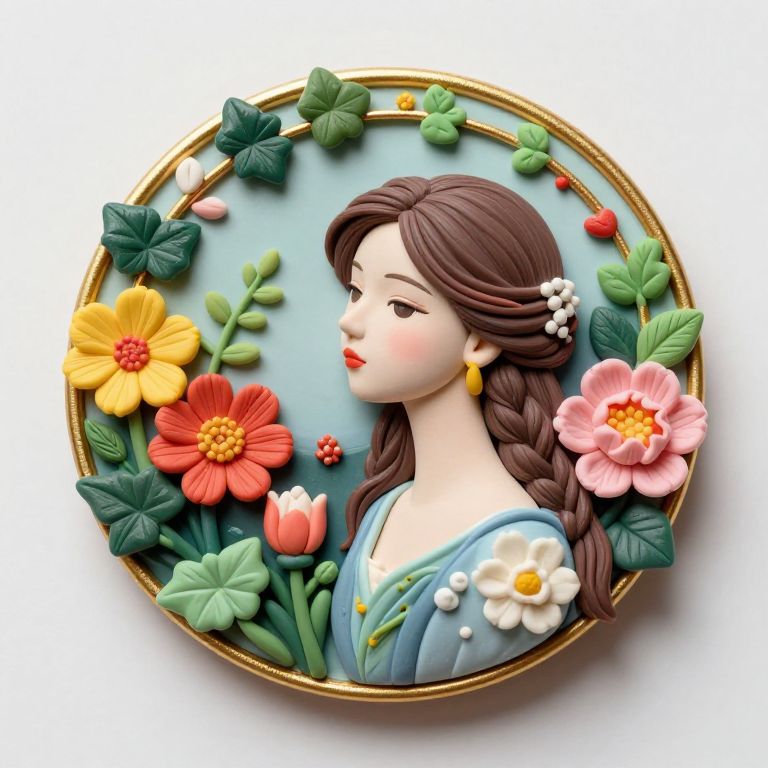 A hyperdetailed, ultrarealistic circular baked clay brooch features intricate, feminine floral landscapes with vibrant colors, including ivy and gold frames, creating a stunning craft piece.