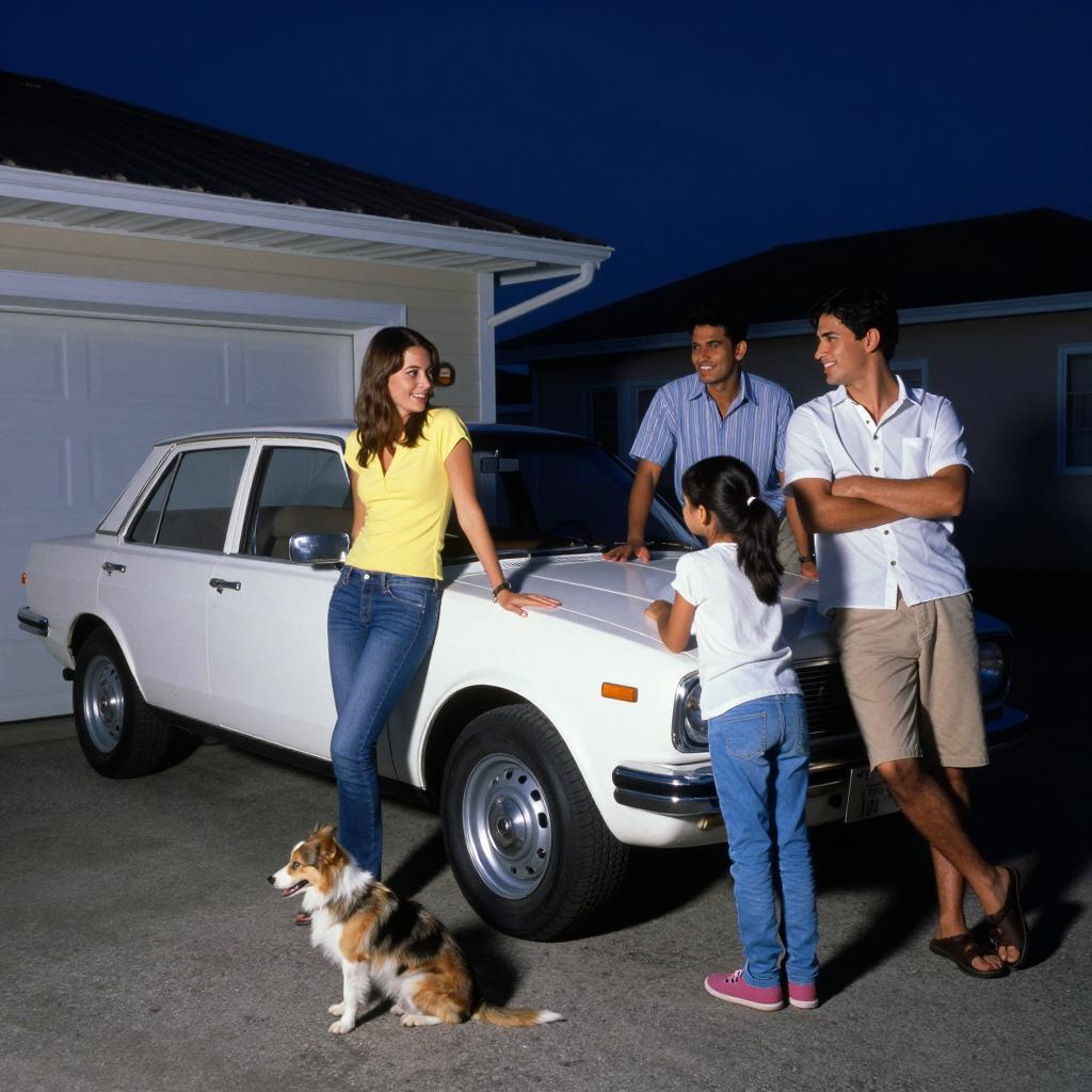 Nighttime photograph. Four people, two men, one woman, and one girl, near a large, parked, white vintage car. Dog at the front. Woman in yellow top, men in shirts and shorts, girl in white shirt and blue pants. House with metal awning in background. Blue lighting. People standing and leaning on car.