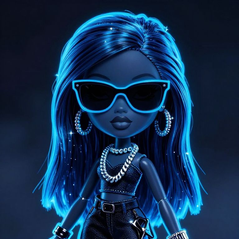 Digital CGI image of a blue-lit, dark-skinned doll with glowing blue hair, large neon sunglasses, hoop earrings, beaded necklace, and
