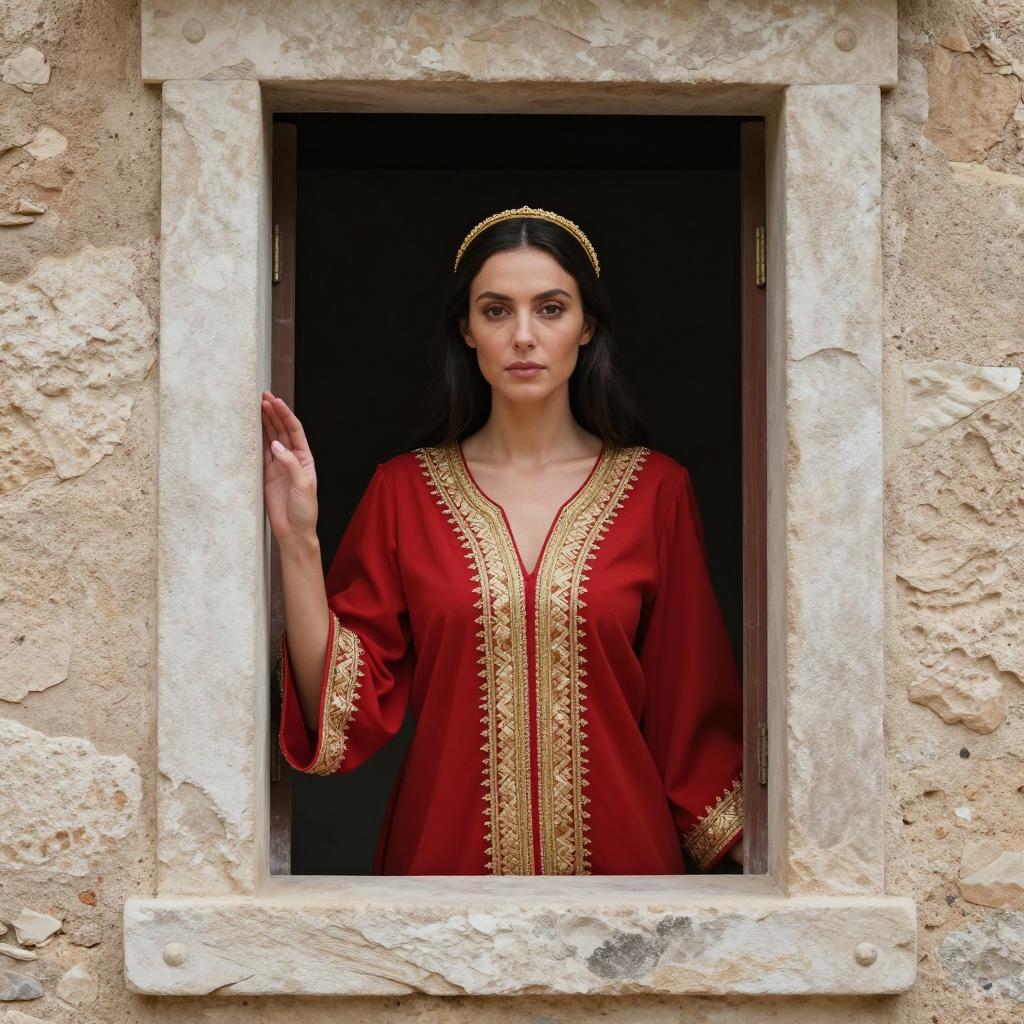 Woman with fair skin and dark hair in a gold headband, wearing a red and gold embroidered dress, leans out of a stone window. Her right hand rests on the window frame. Stone wall background. She has a neutral expression.